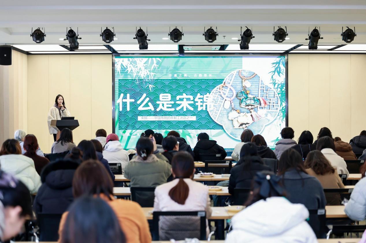 非遗宋锦挂饰制作是本次系列活动的一大爆款亮点,分别于 3 月 4 日、3 月 9 日在图书馆四楼报告厅举办两场,现场座无虚席、人气爆棚。